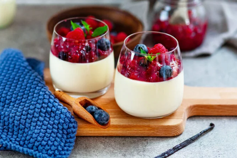 Das Topping: Hierfür einen halben EL Stärke in 2 EL kaltem Wasser glattrühren. 150gr TK-Beeren und 1,5 EL Zucker in einem Topf aufkochen. Angerührte Stärke einrühren und unter ständigem Rühren nochmals aufkochen. Vom Herd nehmen und abkühlen lassen. Panna Cotta mit Beeren-Topping servieren.